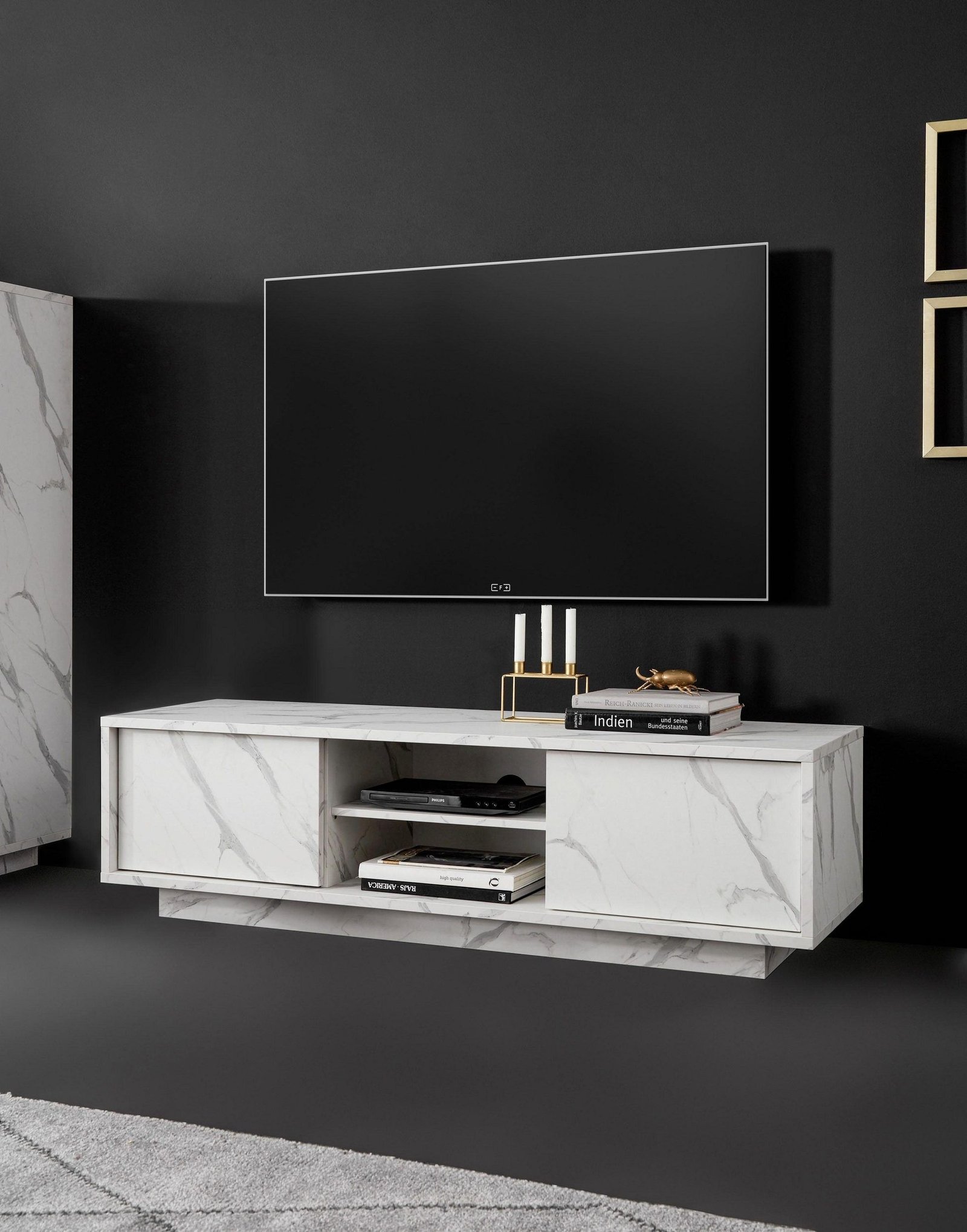 Marble elegance, everyday simplicity. Dreaming of a calm and clutter-free living room? This TV bench is more than just a place for your screen; it’s a smart piece of decor that blends the luxury of marble with clean, modern lines. With a mix of open shelving and hidden storage, there’s a place for everything. Cables stay neatly tucked away at the back, leaving you free to enjoy your favorite movies without distraction.