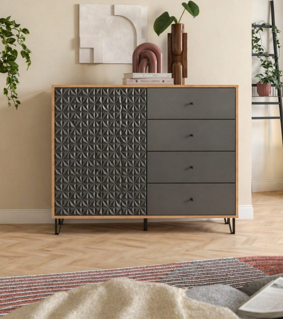 Storage: Generous layout including 3 large central drawers and 2 side storage units with shelves.