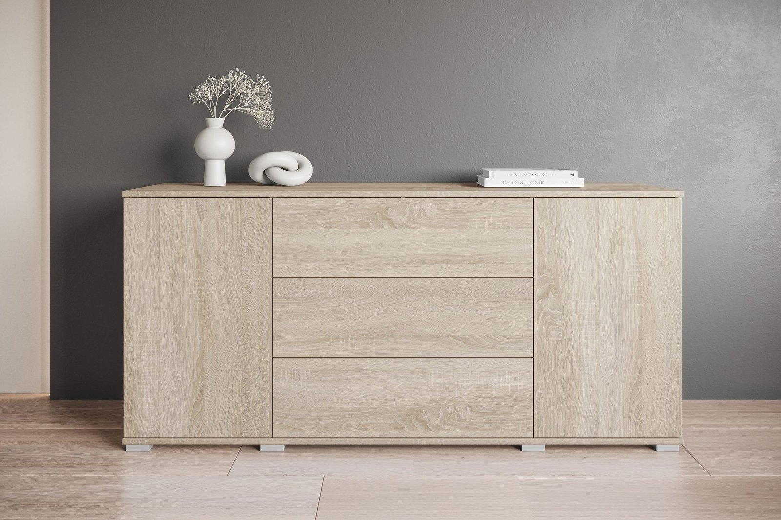 This sideboard brings that feeling instantly, with its calm wood tone and simple details.