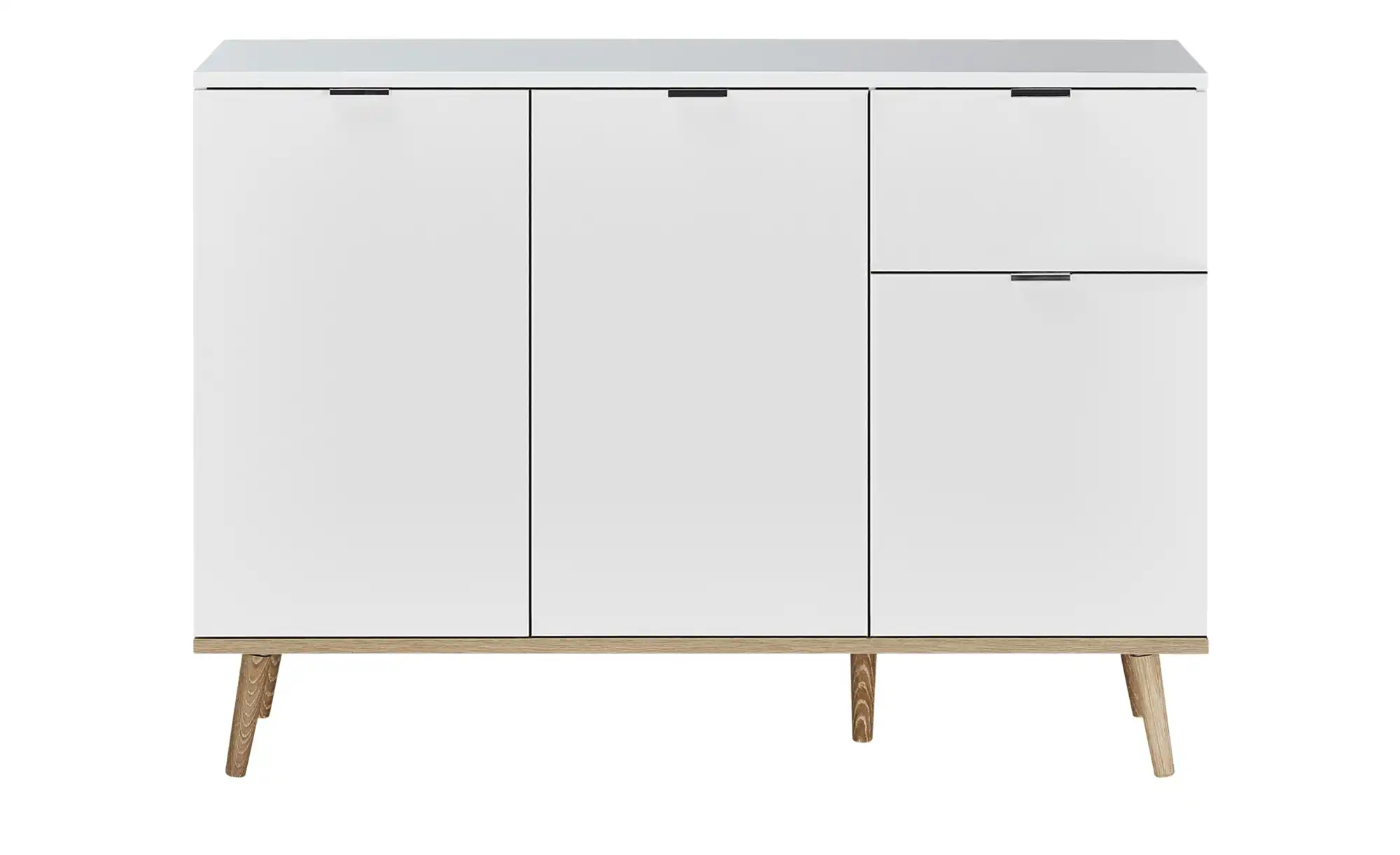 التصميم: واجهة بيضاء ناعمة مع مقابض معدنية رفيعة وأرجل خشبية مائلة.