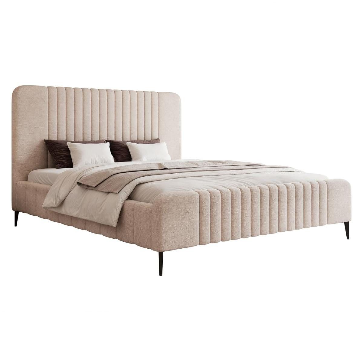 التصميم: خطوط طولية متوازية (Vertical Channel Tufting) تغطي اللوح الأمامي ومقدمة السرير لإعطاء شعور بالارتفاع والأناقة.
