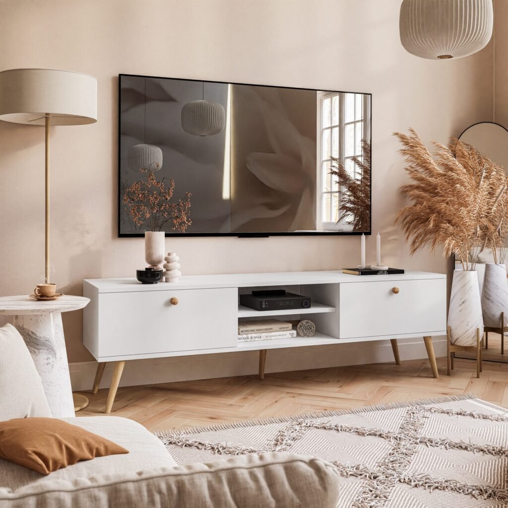 • التخزين: تحتوي على دلفة مغلقة في المنتصف باللون الأبيض، يحيط بها رفان مفتوحان على الجانبين باللون الخشبي لتنظيم أجهزة الاستقبال أو قطع الديكور.